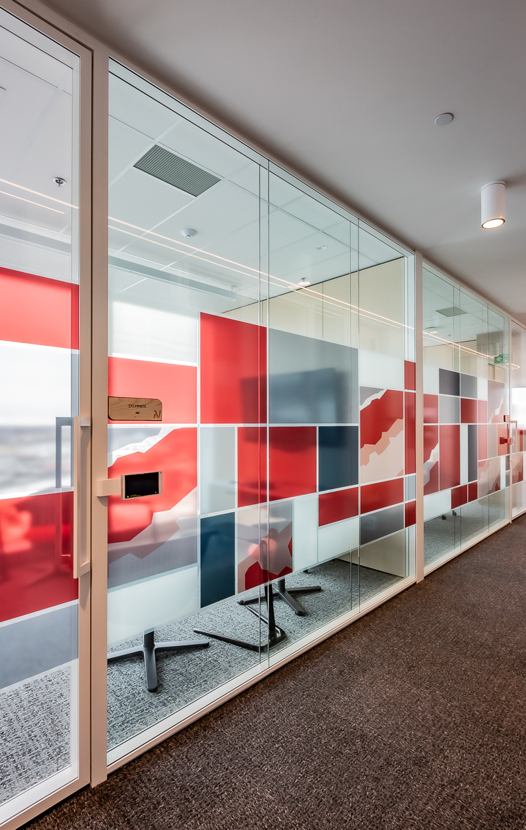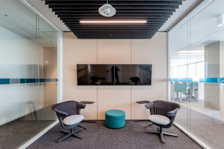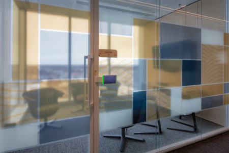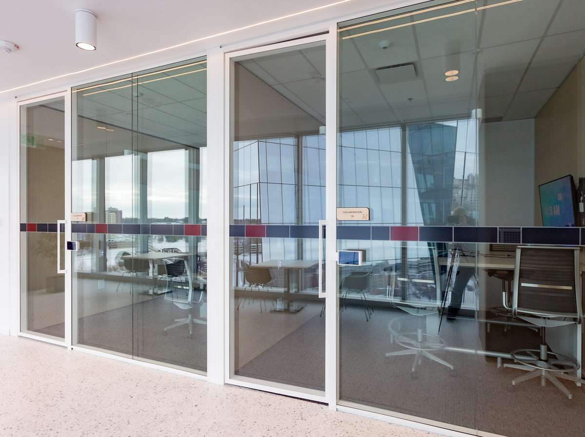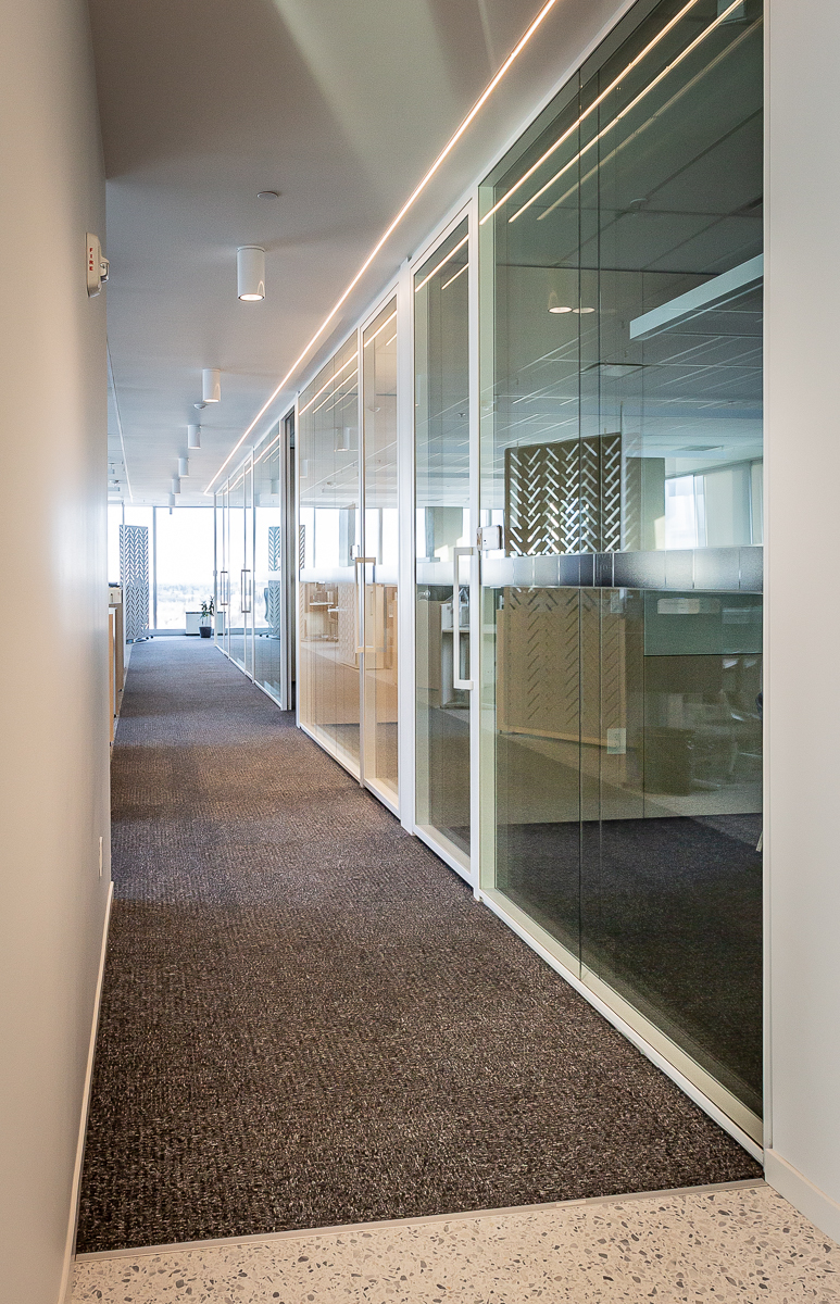 Focus’s 10’ monolithic double-glazed option was used for all office fronts with 12 mm laminated glass, providing the acoustic performance necessary to achieve an overall 45+ stc rating while maintaining a minimal architectural presence. The Focus doors, designed to parallel the acoustic properties and visual privacy features found in the glass, were outfitted with 24” linear pulls and soft close mechanisms with a hold open feature to add operational ease and comfort.