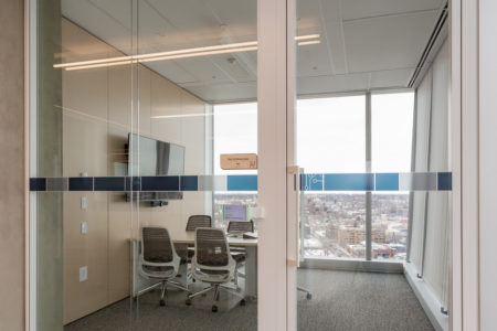 The River Landing Tenant Improvement Project in Saskatoon consisted of a blend of Teknion Focus and Altos demountable wall systems integrated to create offices, meeting rooms & private phone booth rooms throughout 9 floors of a new building in the River Landing Development. With outstanding views, the glass walls provided an open & clean aesthetic harmonizing with the building’s innovative vibe while maintaining a minimalistic presence.