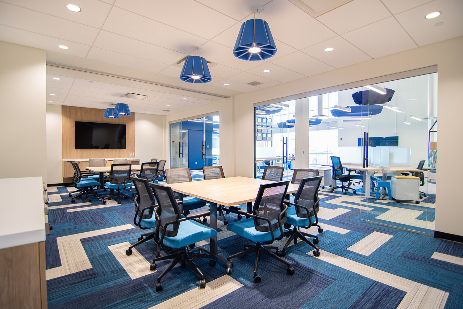 Communal spaces were outfitted with a variety of products to create a vibrant inviting café, numerous warm casual spaces to lounge, and formal meeting rooms. These products range from Teknion’s meeting & café tables with their iconic slim blade legs, Sit-on-It Mika Café Chairs, Teknion Zones Club Chairs & Tea Tables, Global’s Drift lounge series & Rouillard’s Wooden Café Stools. The additional use of Teknion’s training tables paired with Sit-on-It Focus meeting room chairs adds an extra level of flexibility to meeting room spaces while staying within a consistent design.