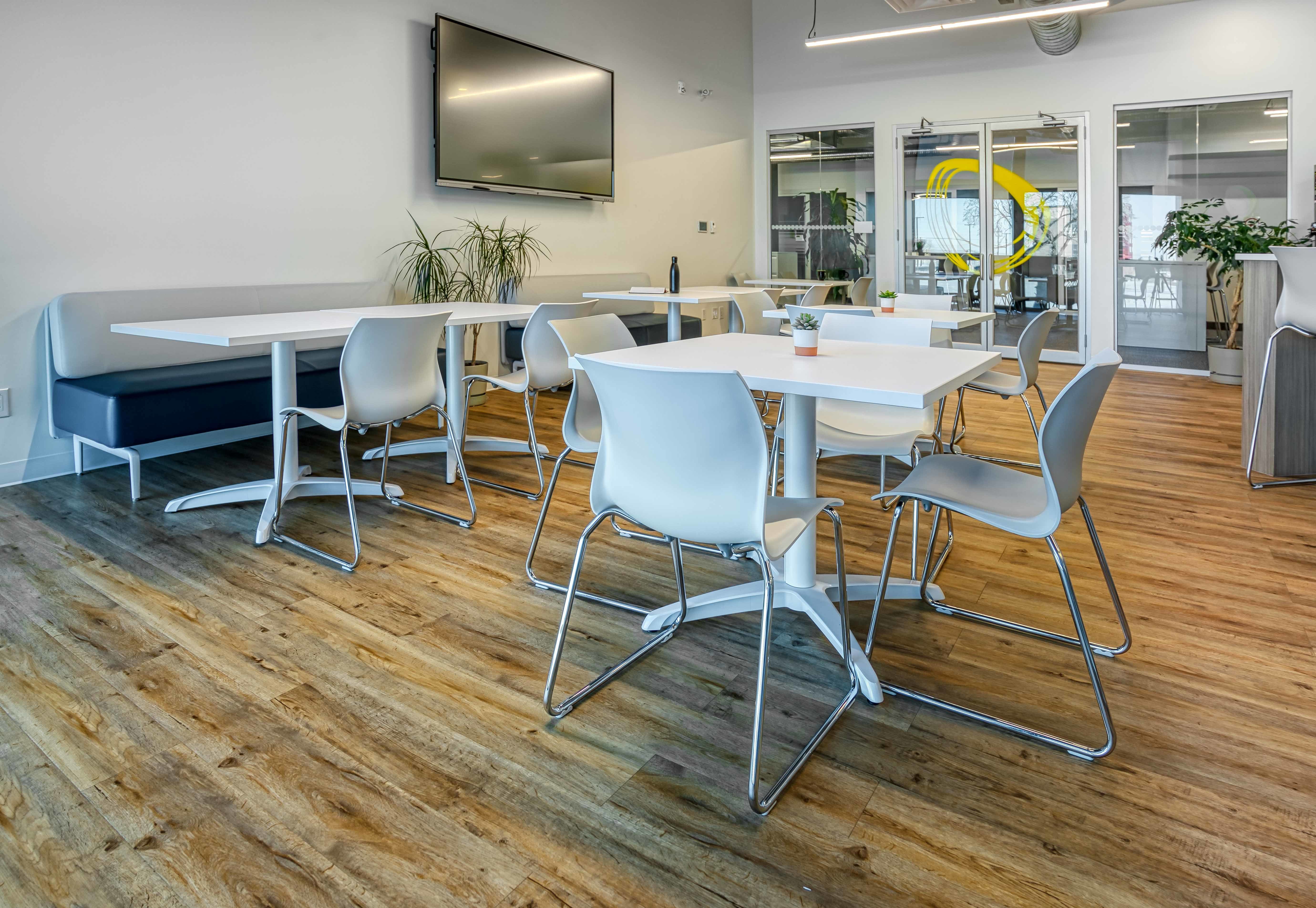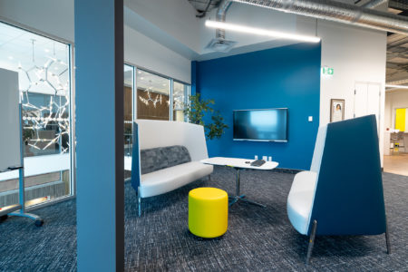 Informal meeting and collaboration areas were achieved with electrified Hub tables complemented by Nami seating, Studio TK’s unique Fractals lounge seating paired with Orano yellow DNA ottomans & Teknion’s Banqs lounge seating with tablets. As well the bright and vibrant café areas created with Expansion tables, Banqs lounge & Nami chairs creates perfect spaces for employee sharing & creativity.